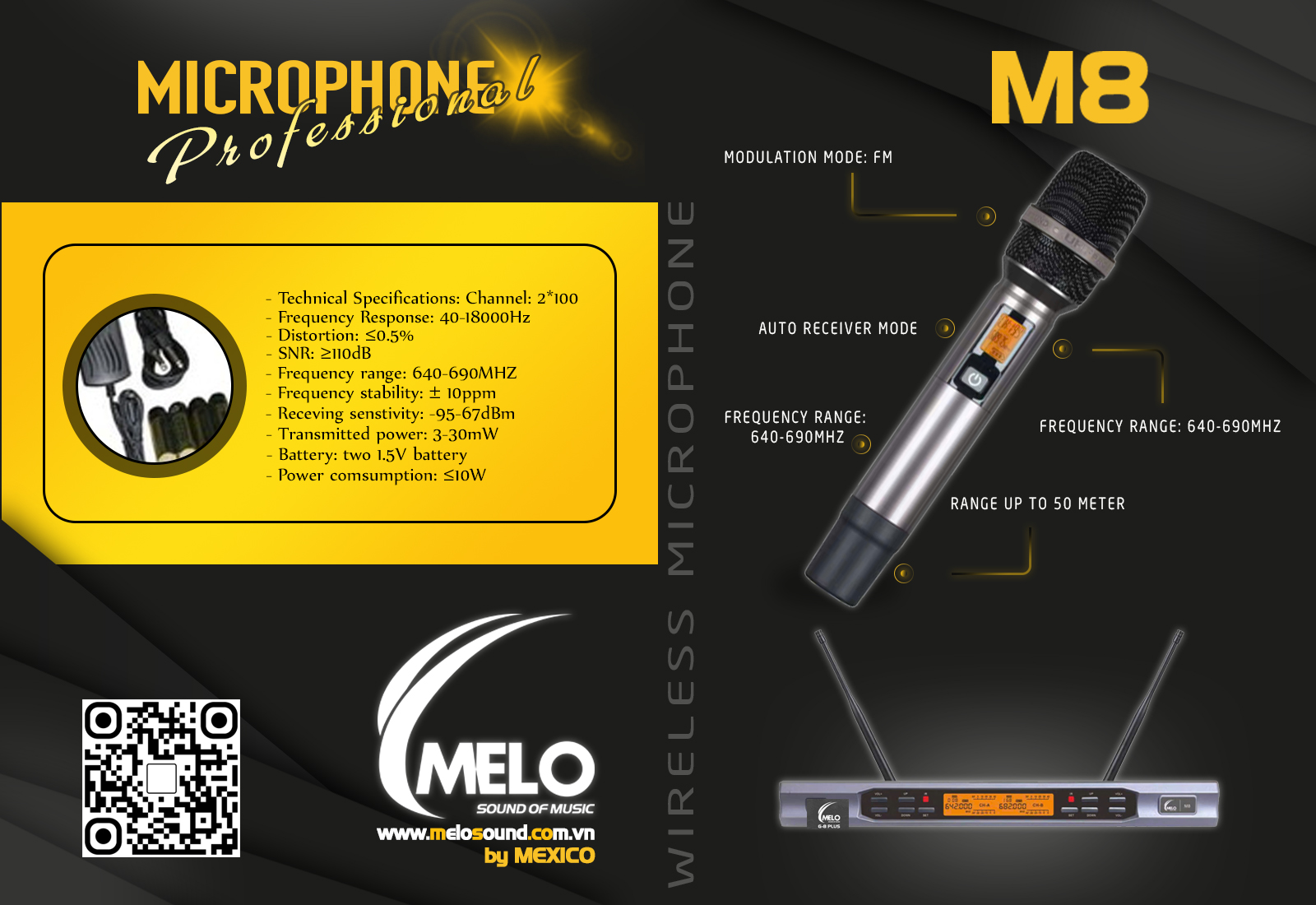 Micro Melo Sound M8 dòng micro cao cấp chuyên dùng cho ca sĩ chuyên nghiệp, sản phẩm chính hãng Melo Sound nhập khẩu phân phối bởi Công Ty Melo Sound Việt Nam được sử dụng trong các dự án âm thanh chuyên nghiệp.